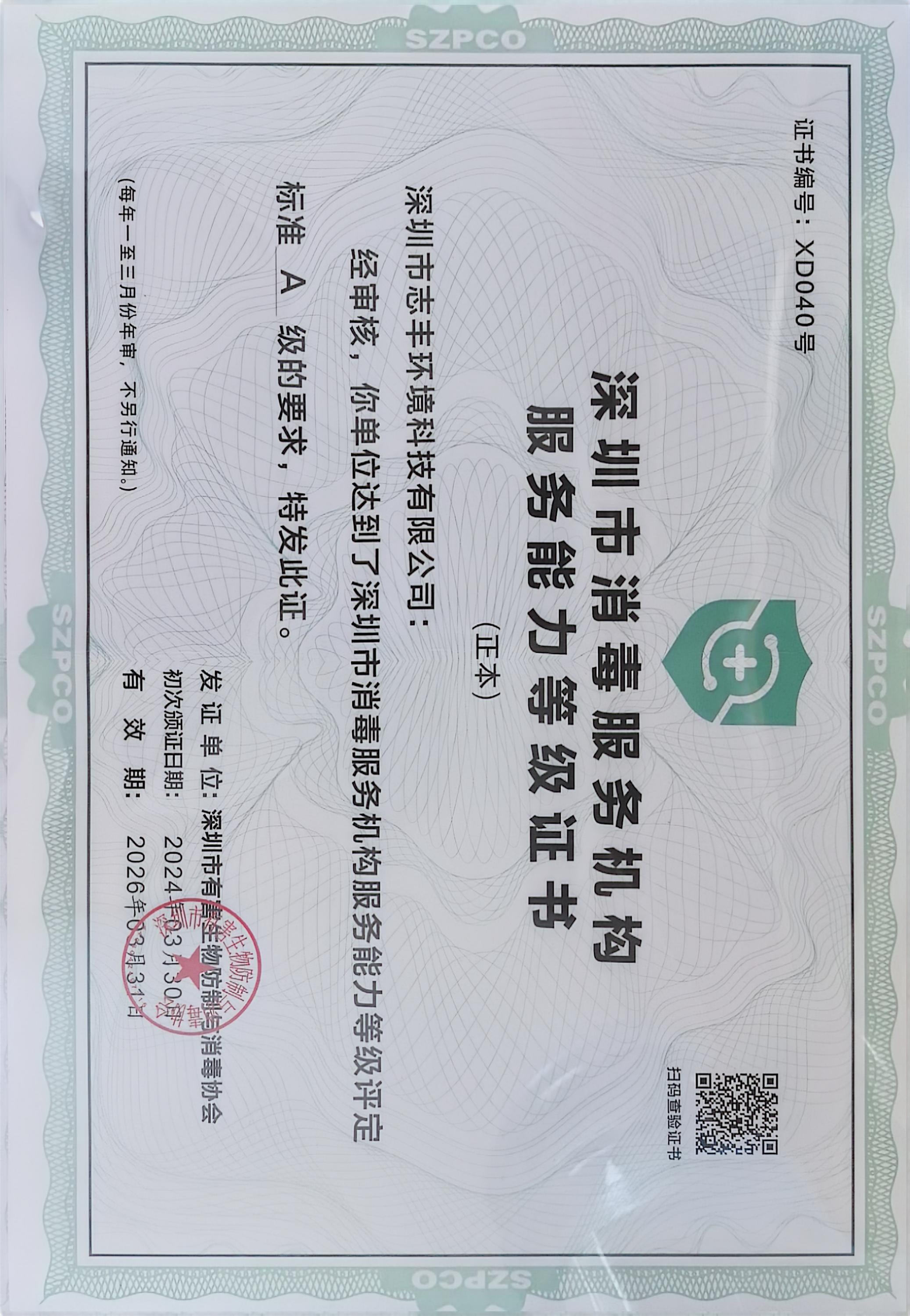 深圳市消毒服務機構A級服務能力證書